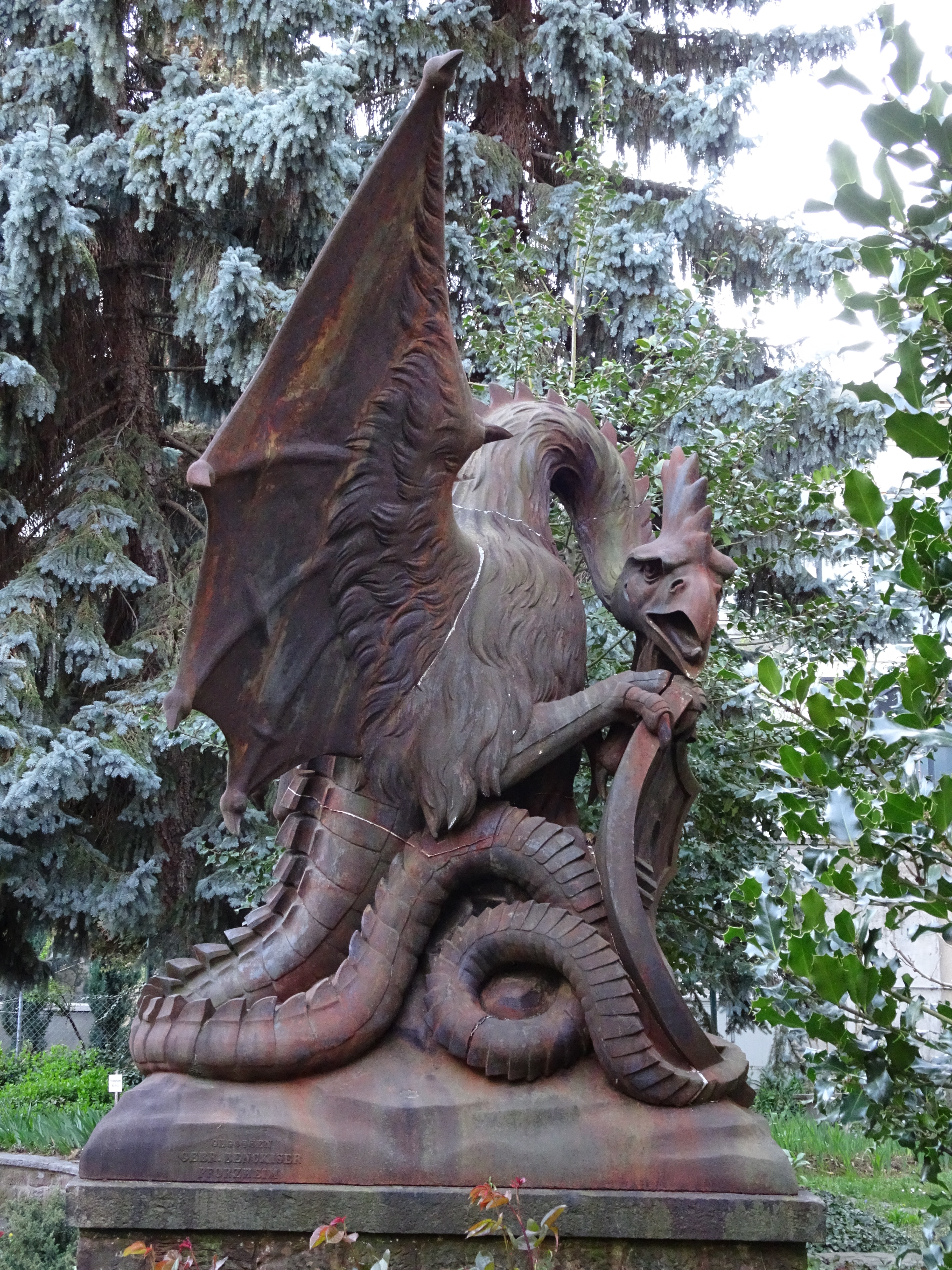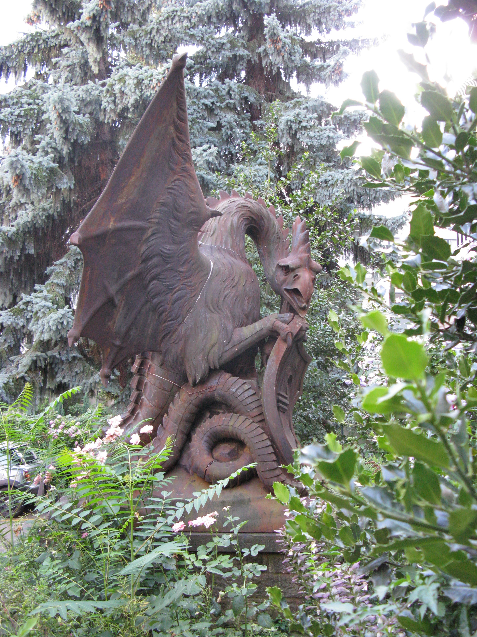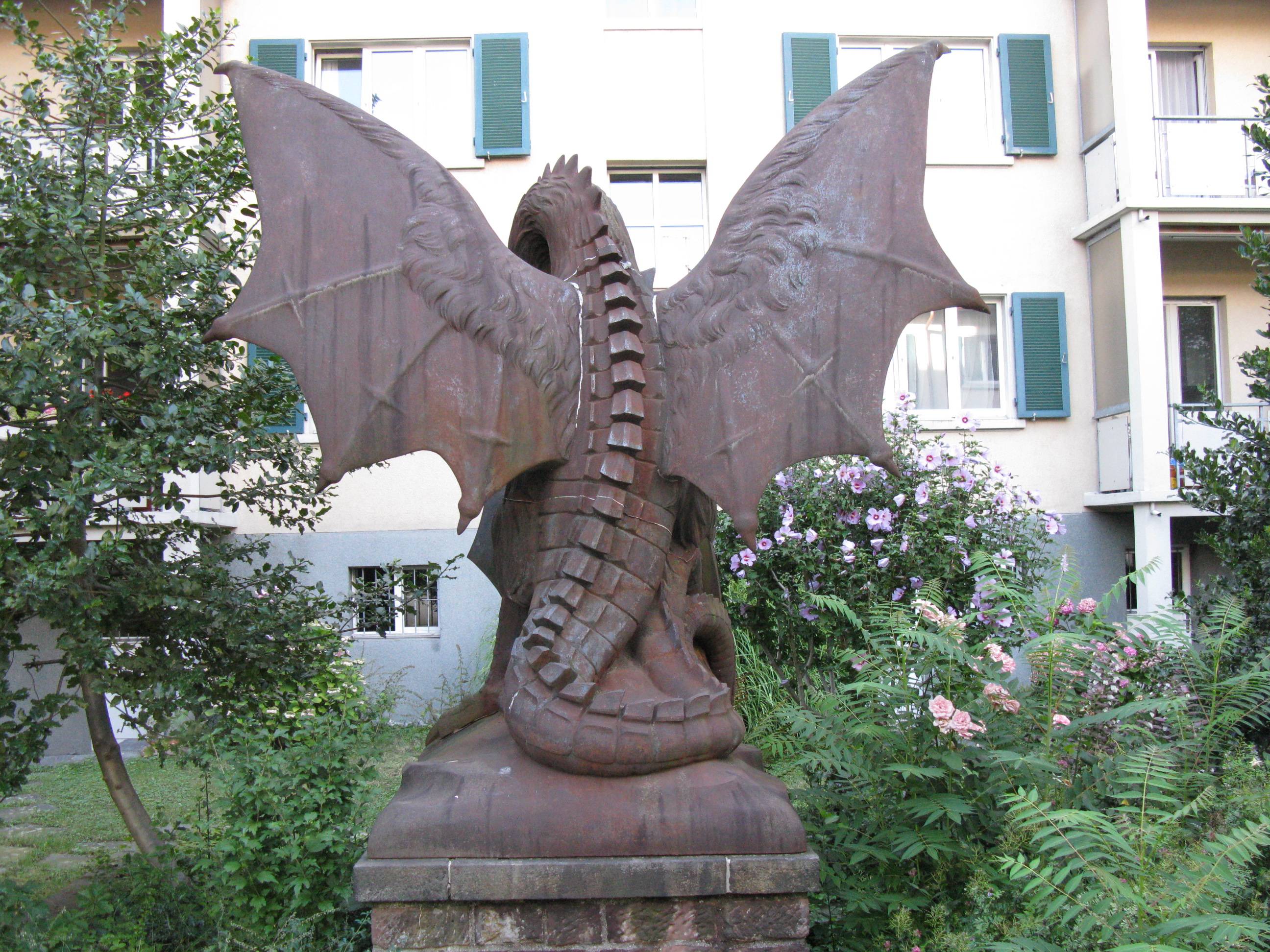 Riesig, rostig und romantisch hockt der Basilisk im Hinterhof des Hauses ‹Zum Basilisk› an der Schüztenmattstrasse 35. Neben der einzigartigen Rostoptik besticht dieser Basilisk durch sein putziges Lauern im Gesträuch. Für die technisch Interessierten sind die Fugen und Nähte des aus zehn Teilen zusammengesetzten Monsters spannend.